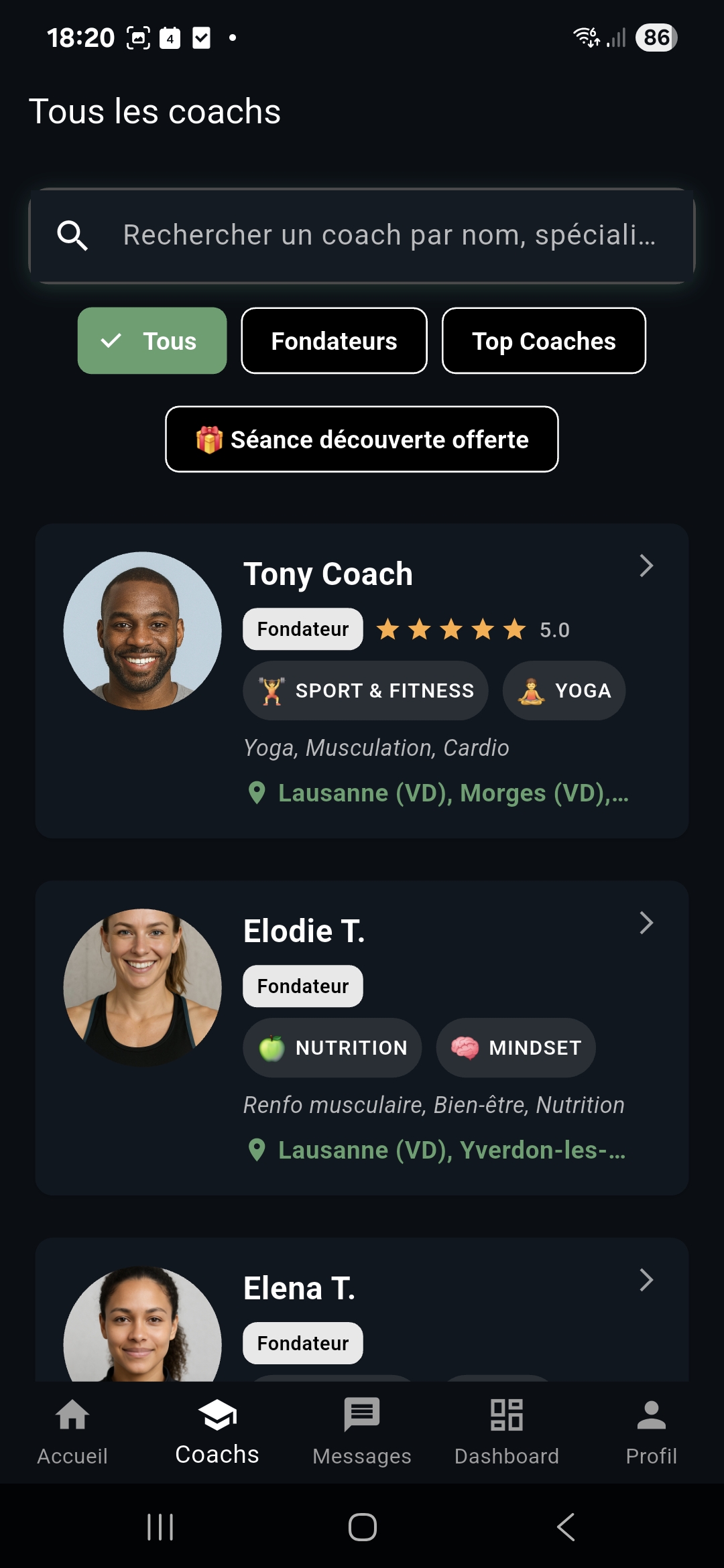 Un espace où les clients découvrent les coachs sereinement, comparent, et prennent contact lorsqu’ils sont prêts.